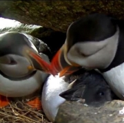 Once the puffling hatches, the parents go into overdrive to care for it. For the first few weeks, one stays in the nest brooding the baby or, when it gets larger, just throwing a wing over it. The other parent goes fishing and the two trade shifts all day. When the baby is old enough to thermo-regulate, both parents spend most of their time fishing. Pufflings are prodigious eaters.